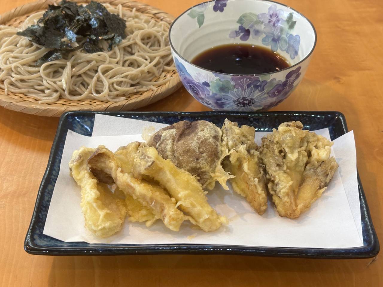 秋の味覚のきのこ(舞茸、椎茸、エリンギ)の三種を天ぷらで揚げました。